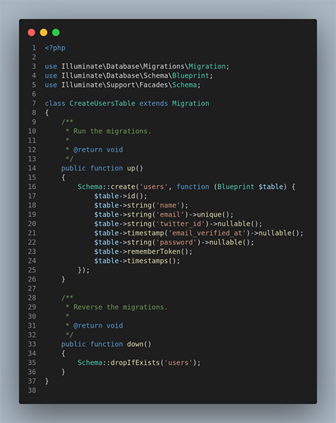 'facebook' => [ 'client_id' => env('FACEBOOK_CLIENT_ID'), 'client_secret' => env('FACEBOOK_CLIENT_SECRET'), 'redirect' => env('FACEBOOK_REDIRECT_URL') ],We need to update our user_migration file to accommodate Facebook login credentials once a user chooses to use it.